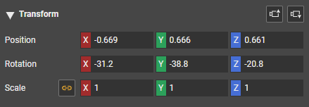 - (optional) To easily create a camera view based on the active Scene View, you can click the right camera button in the Object Properties > Transform section.