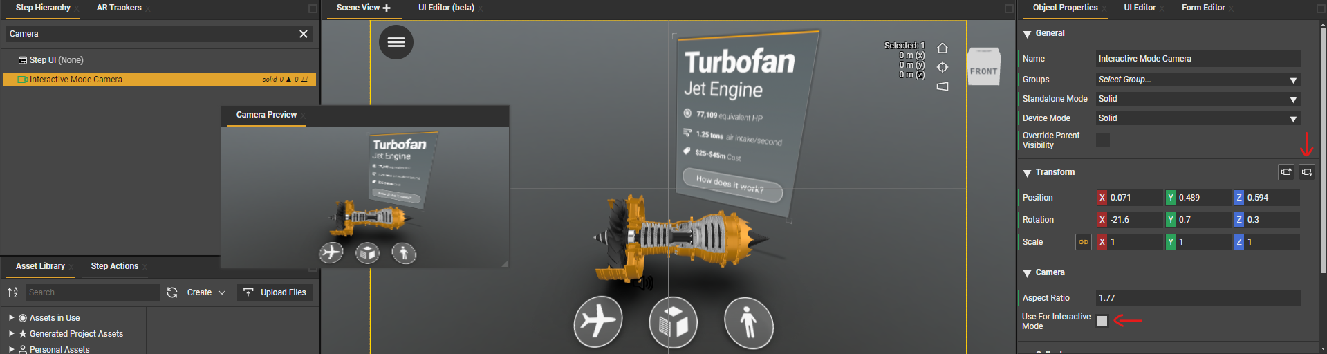 As mentioned, you can use the "use the scene view camera transform values" button to align the camera with the active scene view. - (optional) You can add a focus point to the interactive mode camera.
