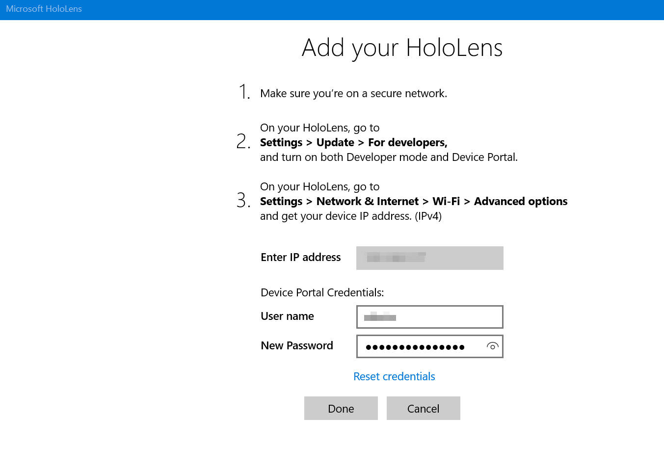 - Click "Add a device" to add your HoloLens 2 device, then add your IP address and Device Portal username and password (Follow the instructions to retrieve your IP address). Click "Done".