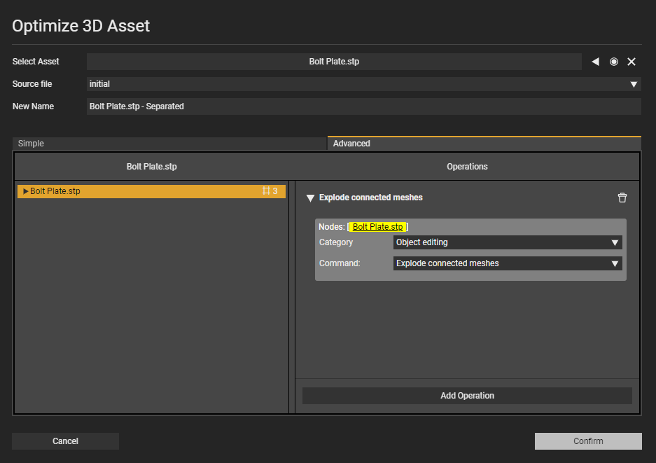 To begin the process, let's navigate to the imported file in the asset library. Right click your file and select "Optimize Asset". This will open a new floating window for the Asset Optimizer and select the "Advanced" tab