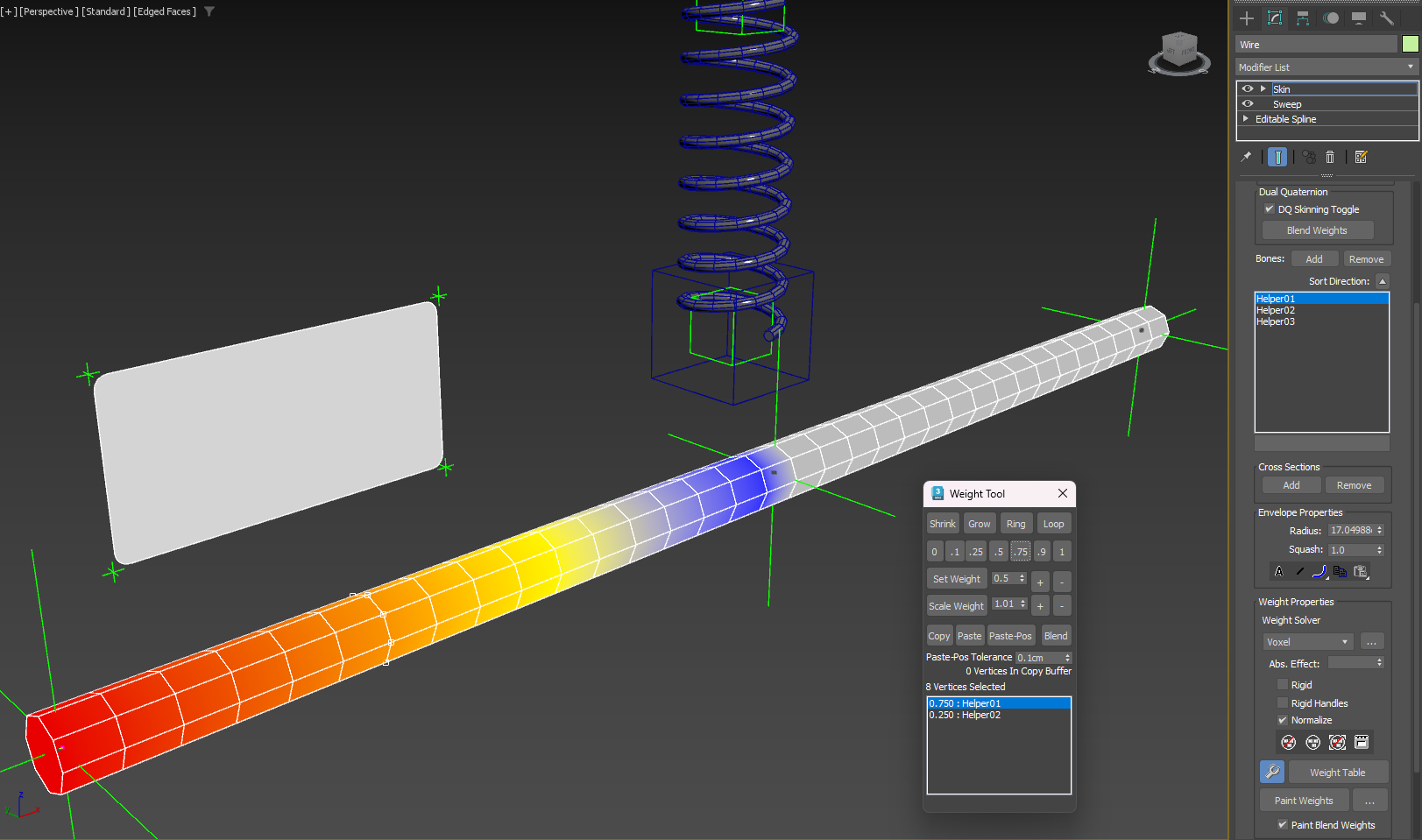 Each vertex in a skinned mesh has a weight value of 0 - 1.0. Weight determines how much the vertex will follow each helper object. This value must add up to 1 and will be split between multiple helpers if more than one is assigned to control a vertex.