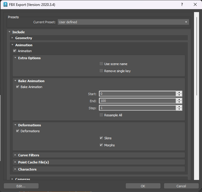 Once you're satisfied with your deformable object you can export the collection from 3ds max into the autodesk fbx format. When exporting, you will need to include the “Animation” and “Deformations” categories. To include animation, the “Bake Animation” category should also be enabled.